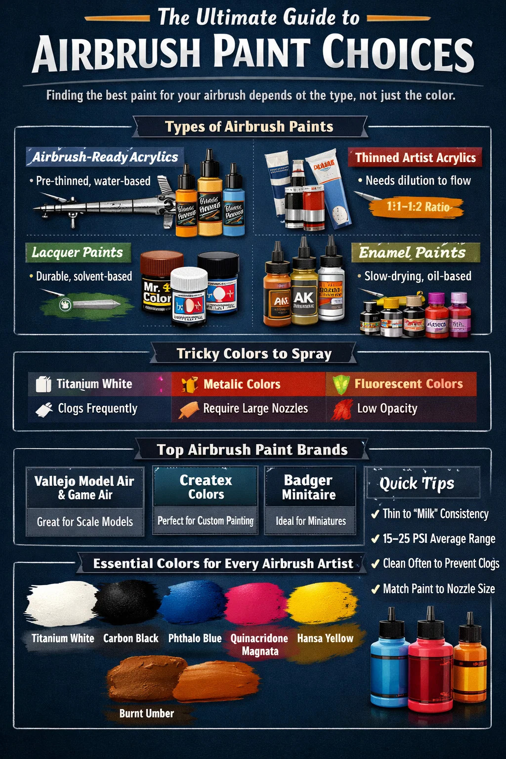 Ang pinakamagandang kulay ng airbrush ay ang malinis na dumadaloy sa iyong setup, nakadikit sa ibabaw mo, at nakakamit ang epekto na iyong hinahangad. — at iba ang sagot na iyon para sa bawat artist, bawat proyekto, at bawat airbrush. Ang pag-unawa sa mga prinsipyo sa likod ng laki ng pigment, lagkit, at chemistry ng pintura ay naglalagay sa iyo sa posisyon na gawin ang paghatol na iyon nang may kumpiyansa sa bawat oras.