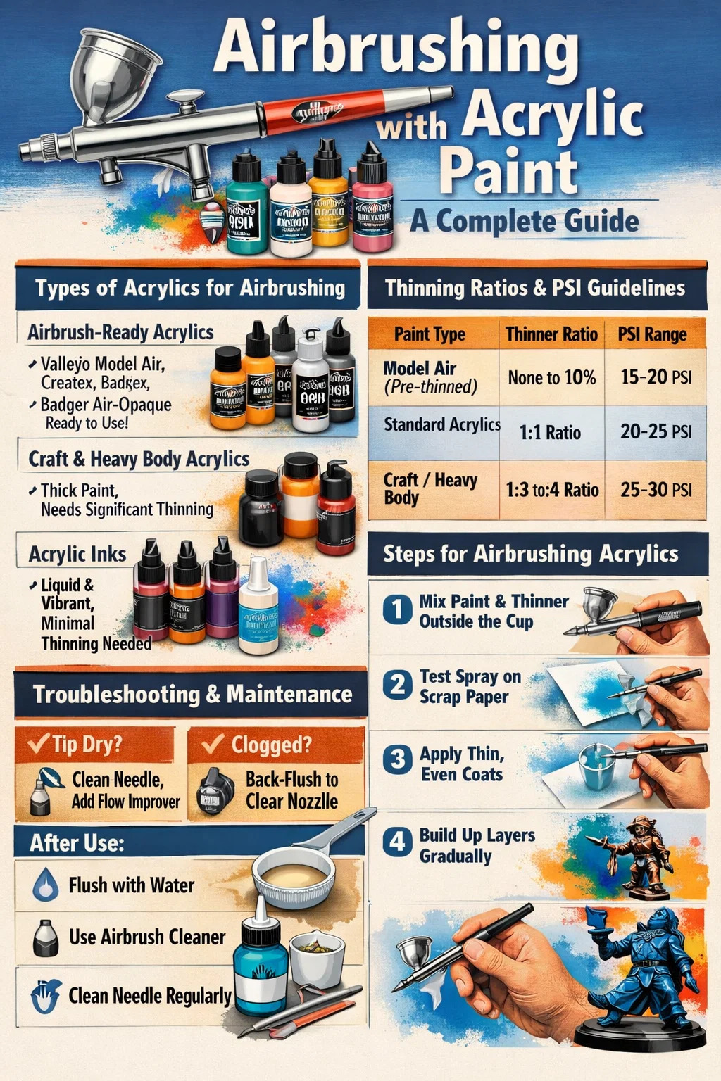 Ang mga acrylic ay natuyo sa isang mala-plastik na pelikula na hindi tinatablan ng tubig kapag nagaling. Ginagawa nitong paglilinis ang airbrush kaagad pagkatapos gamitin hindi mapag-usapan.