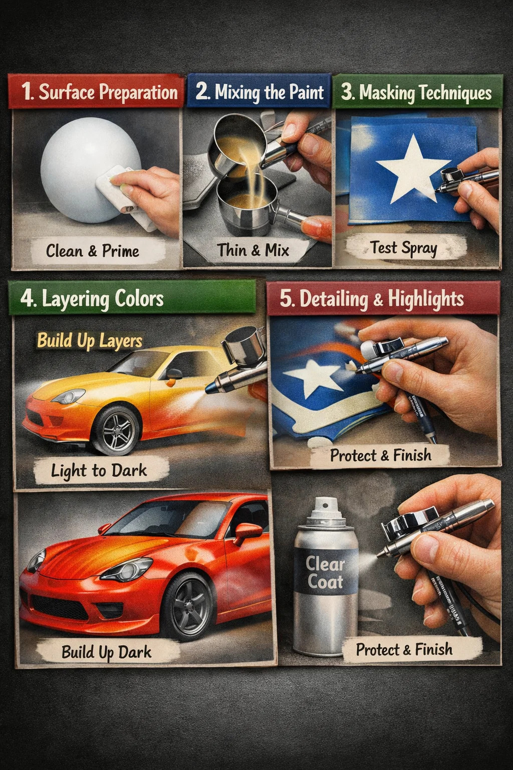 Karaniwang sinusunod ng pagpipinta ng airbrush ang lohika ng "mga light color muna, pagkatapos ay dark colors."