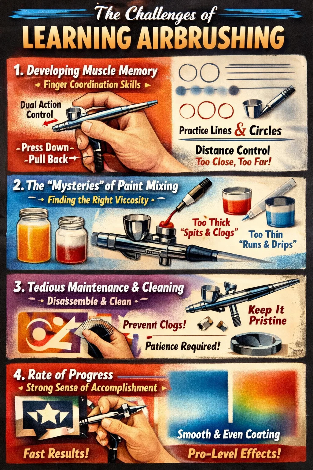 Ang pag-aaral ng airbrushing ay isang kasanayang "madaling simulan, ngunit nangangailangan ng ilang pagsisikap upang makabisado." Hindi tulad ng mga tradisyunal na brush o panulat na direktang nakikipag-ugnayan sa ibabaw, mas katulad ito ng isang pamamaraan ng pagmamanipula ng "may kulay na hangin."