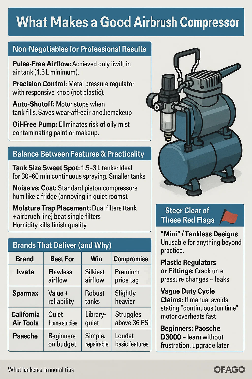 Pulse-free airflow: nakamit lamang gamit ang built-in na air tank (1.5L minimum). Tankless compressor sputter at ruin gradients.